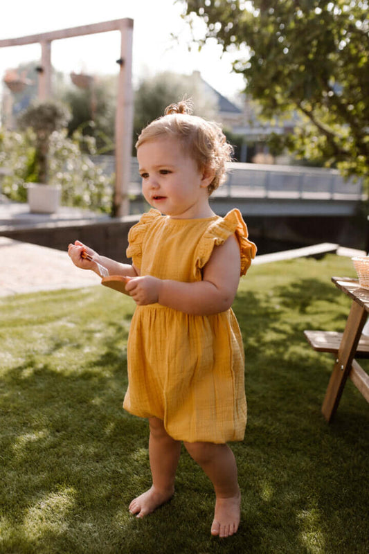 0-3 maanden 3-6 maanden 6-12 maanden 12-18 maanden 18-24 maandenOrganicEra Muslin Romper met ruffles, Mustard
