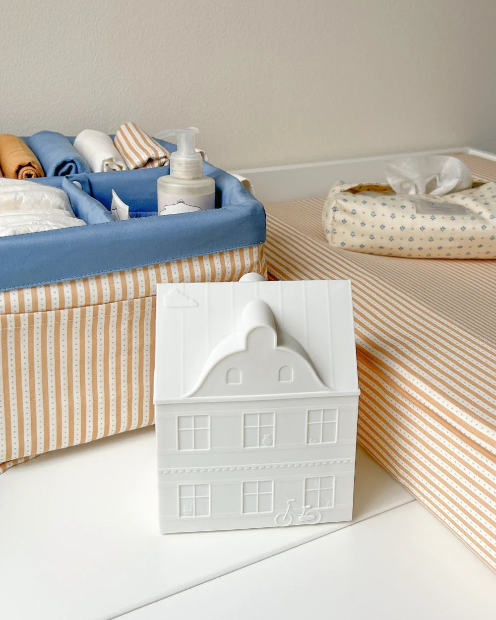 Breng sfeer en rust in de kinderkamer met de Copenhagen Night Light van Cam Cam Copenhagen. Deze charmante nachtlamp is ontworpen in de vorm van een klassiek Kopenhaags herenhuis, compleet met verfijnde details zoals een fiets, een hondje en een silhouet van een zwangere vrouw achter het raam – perfect om de fantasie van je kindje te prikkelen.