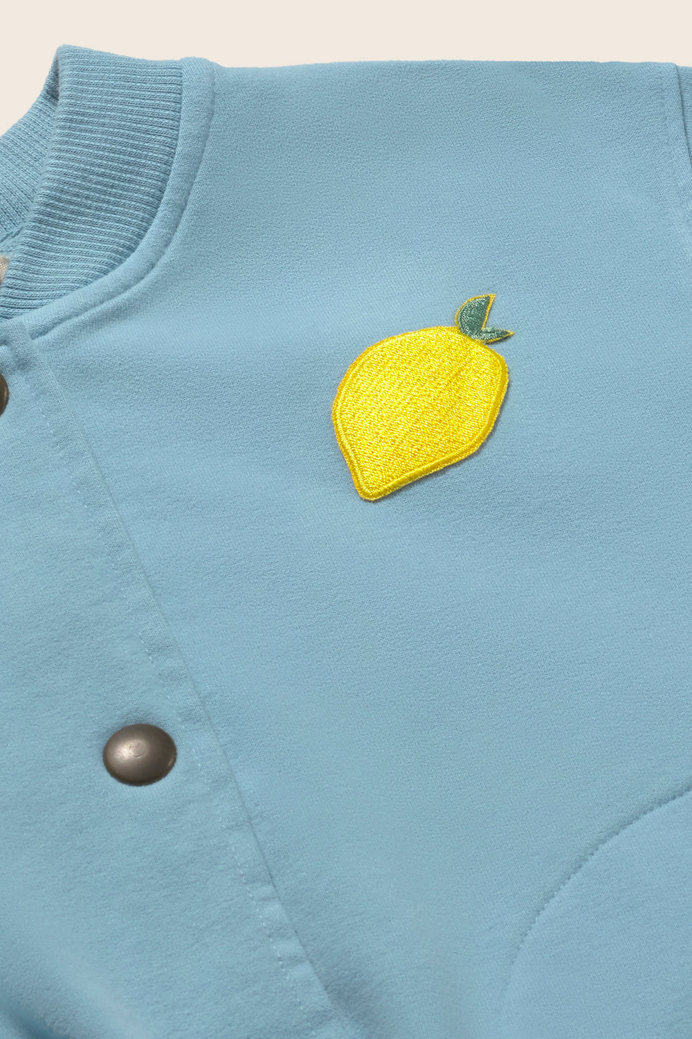 Aan de voorkant zijn subtiele steekzakken verwerkt, die bijdragen aan de klassieke en functionele uitstraling van het ontwerp. Op de borst is een geborduurd citroendetail geplaatst, een speels accent dat zorgt voor een herkenbare en vrolijke Cozmo-touch zonder te overheersen. De buitenzijde van de jas is licht geborsteld, wat zorgt voor een extra zachte, gladde finish en een luxe gevoel.