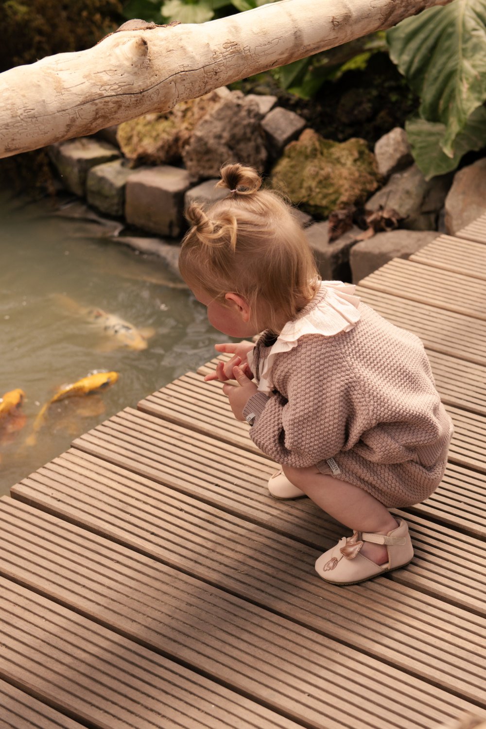 De neutrale plumkleur maakt de Veertje Cardigan ideaal te combineren met allerlei kledingstukken. Denk aan een effen T-shirt en broek voor een casual look, of een jurk met maillot voor een meer geklede outfit. Daardoor is deze cardigan een veelzijdige toevoeging aan elke kindergarderobe, die je keer op keer opnieuw kunt samenstellen.
