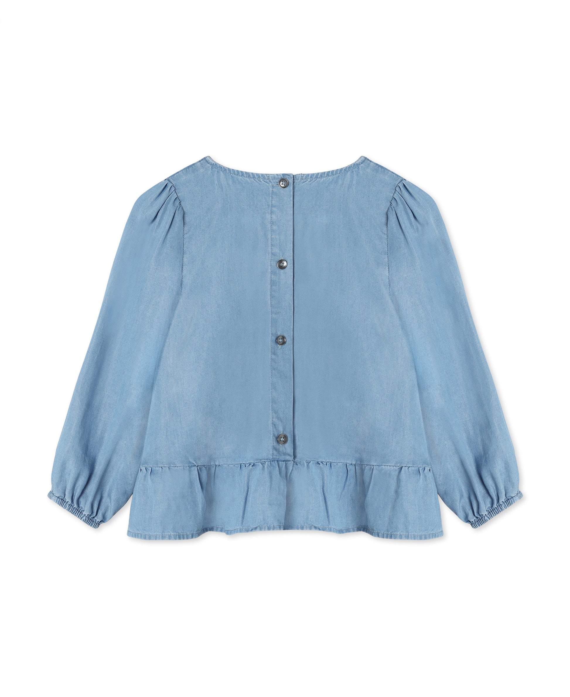 Aan de achterkant is de blouse voorzien van knoopjes over de volledige lengte, wat het aan- en uittrekken eenvoudig maakt. De knopen vormen tegelijk een mooi afgewerkt detail dat perfect aansluit bij het minimalistische en Scandinavische design waar FLIINK om bekendstaat.