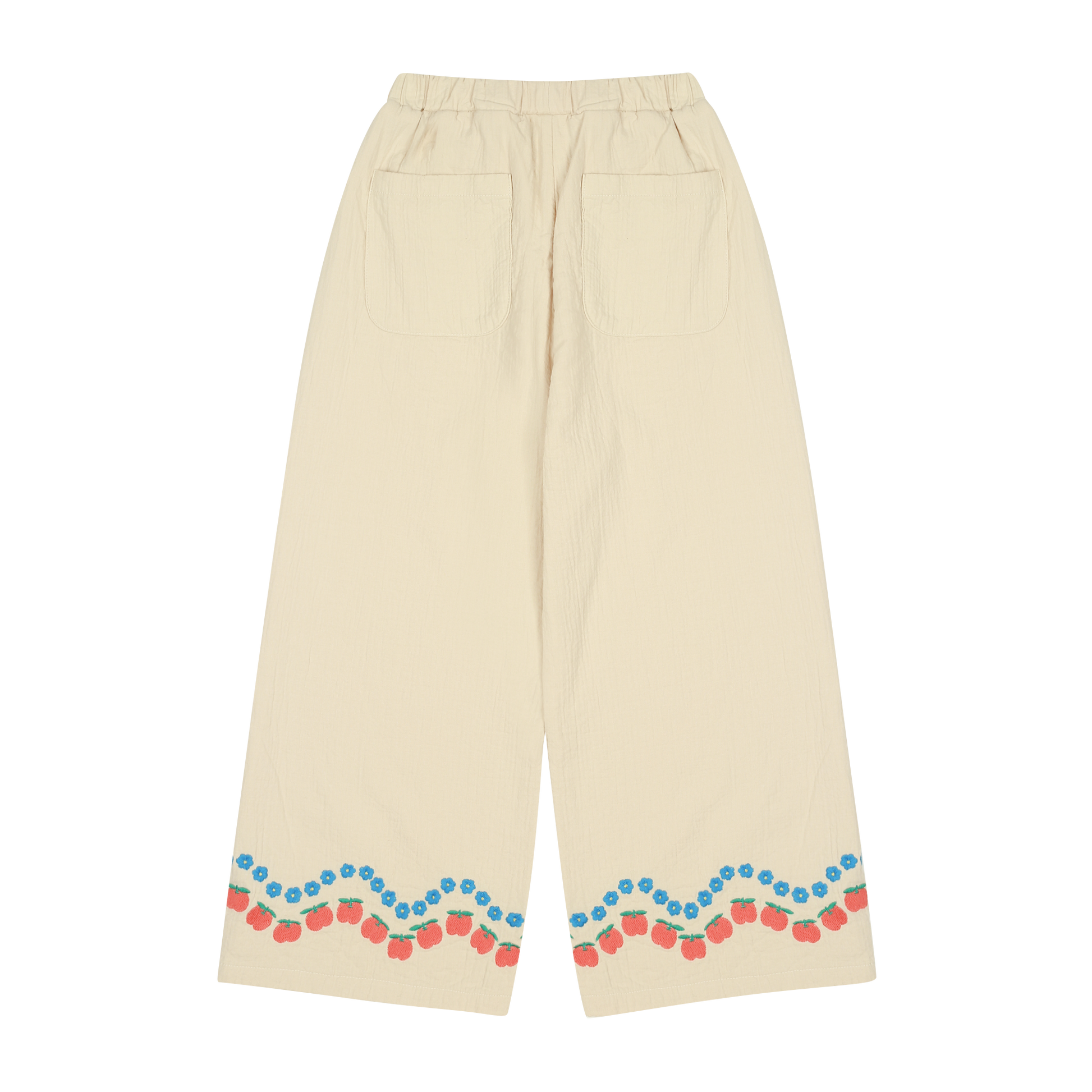 Onderaan de broekspijpen is een geborduurde rand aangebracht met rode appeltjes en blauwe bloemetjes in een golvend patroon. Dit geeft de broek een charmante, bijna handgemaakte uitstraling die perfect past bij de creatieve en eigenzinnige stijl waar Jelly Mallow om bekend staat. De zachte beige basiskleur maakt de broek makkelijk te combineren met zowel neutrale als kleurrijke tops.