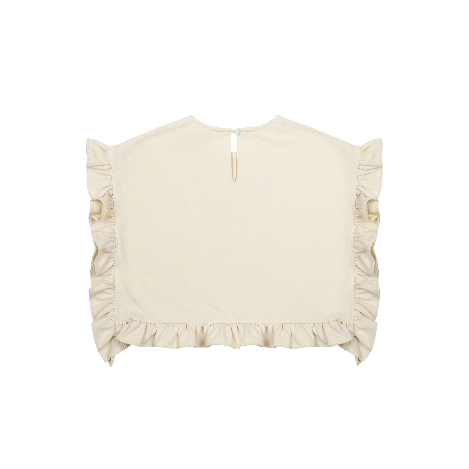 Wat dit model extra bijzonder maakt, zijn de verfijnde ruches langs de armsgaten en de onderzijde. Deze subtiele frills geven het shirt een speelse en meisjesachtige touch, terwijl de rechte, iets boxy pasvorm zorgt voor een moderne look. Dankzij de lichte en comfortabele stof voelt het shirt zacht aan op de huid en biedt het volop bewegingsvrijheid – ideaal voor actieve dagen op school, het strand of in de speeltuin.