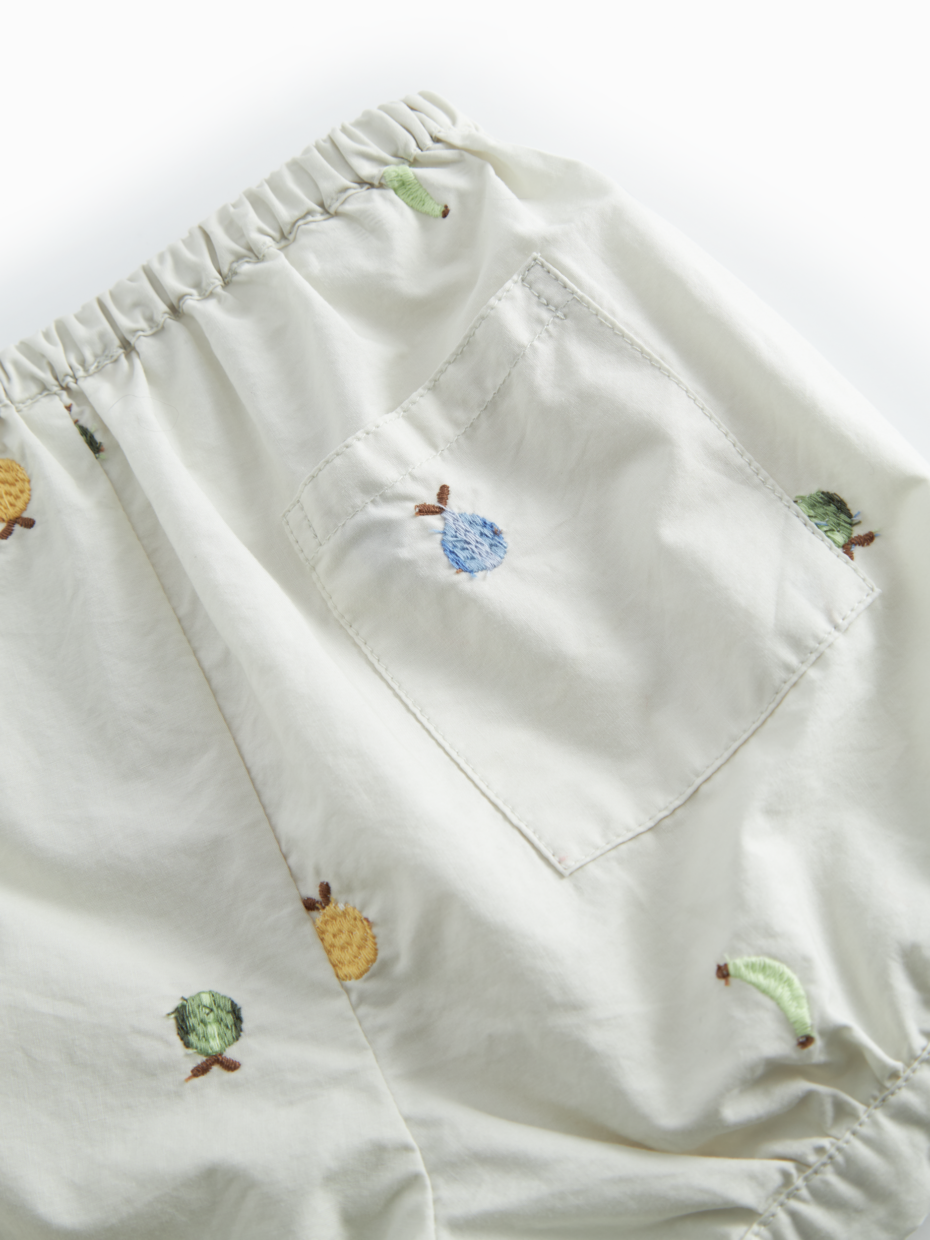De neutrale basis gecombineerd met de kleurrijke fruitborduursels maakt deze short eenvoudig te stylen. Combineer met een bijpassend T-shirt of blouse uit dezelfde collectie voor een complete zomerse look, of draag hem met een eenvoudig rompertje voor een meer casual outfit.