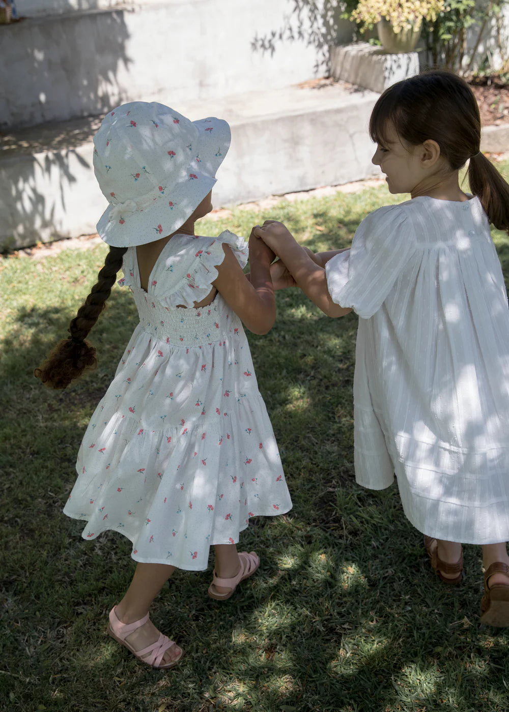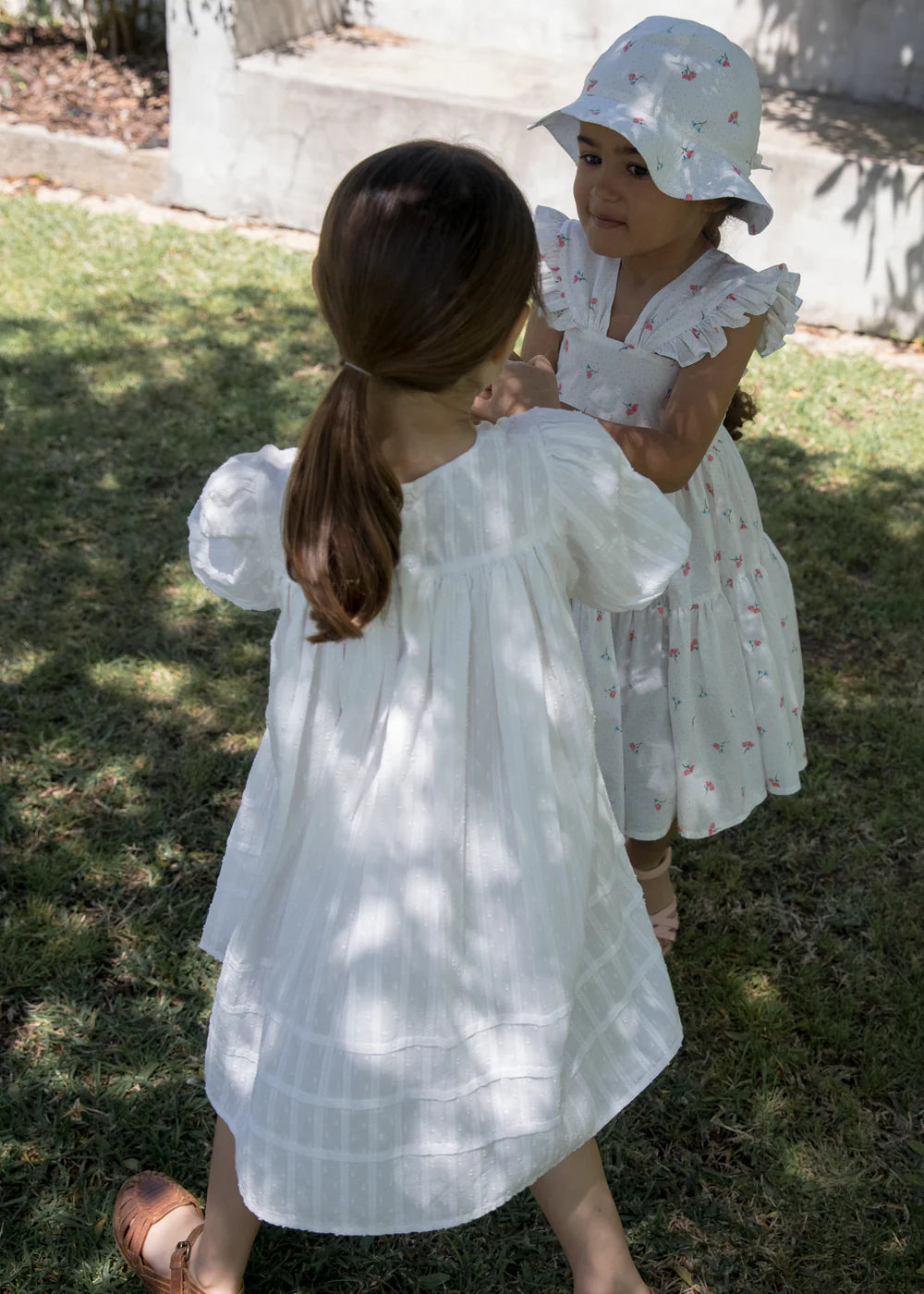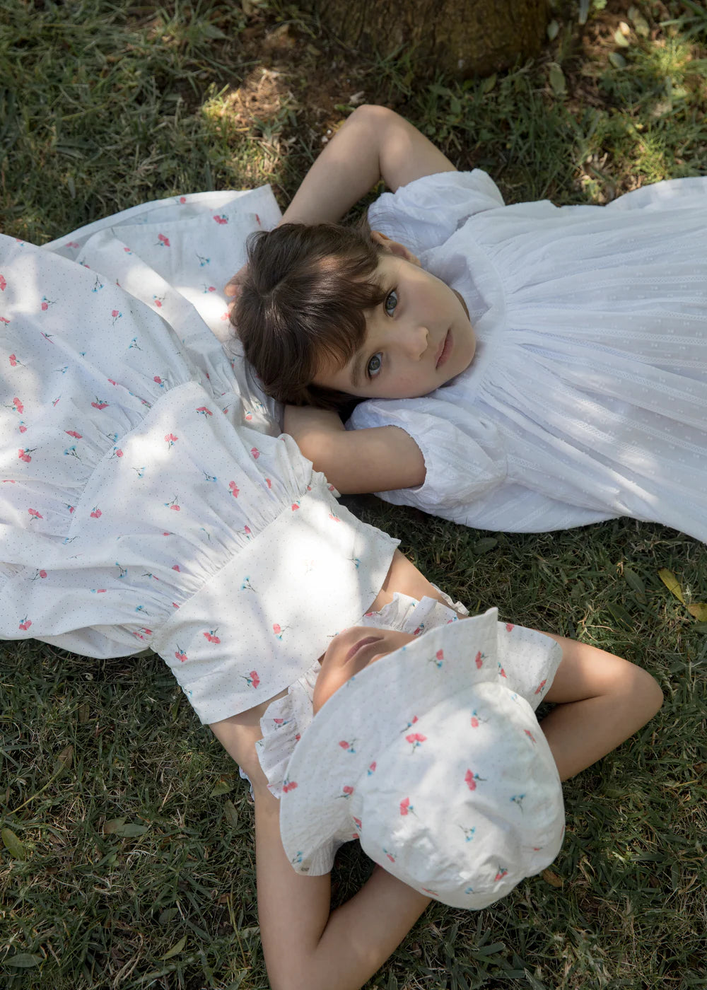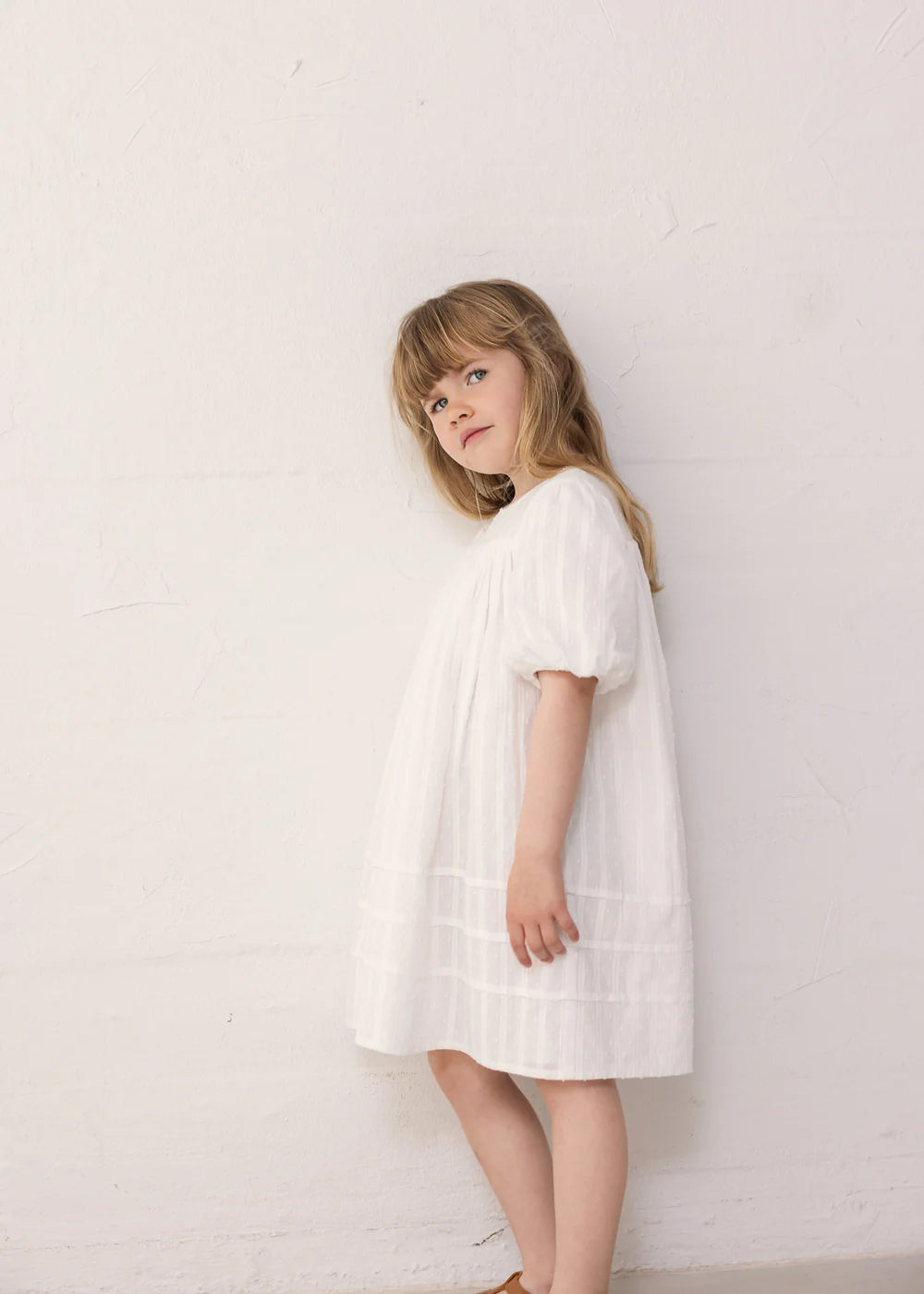 Wat deze jurk echt bijzonder maakt, is het verfijnde design. De jurk heeft korte pofmouwen, een subtiel aangesloten bovenstuk en een losvallende, zwierige rok. Dit zorgt voor een elegante, maar speelse uitstraling die perfect past bij zowel dagelijkse momenten als speciale gelegenheden. Denk aan een zomerse dag op het strand, een verjaardag of een familiefeest.