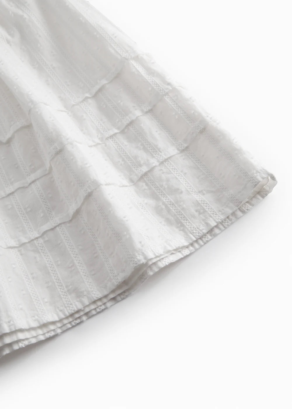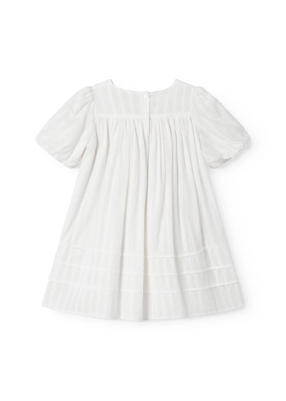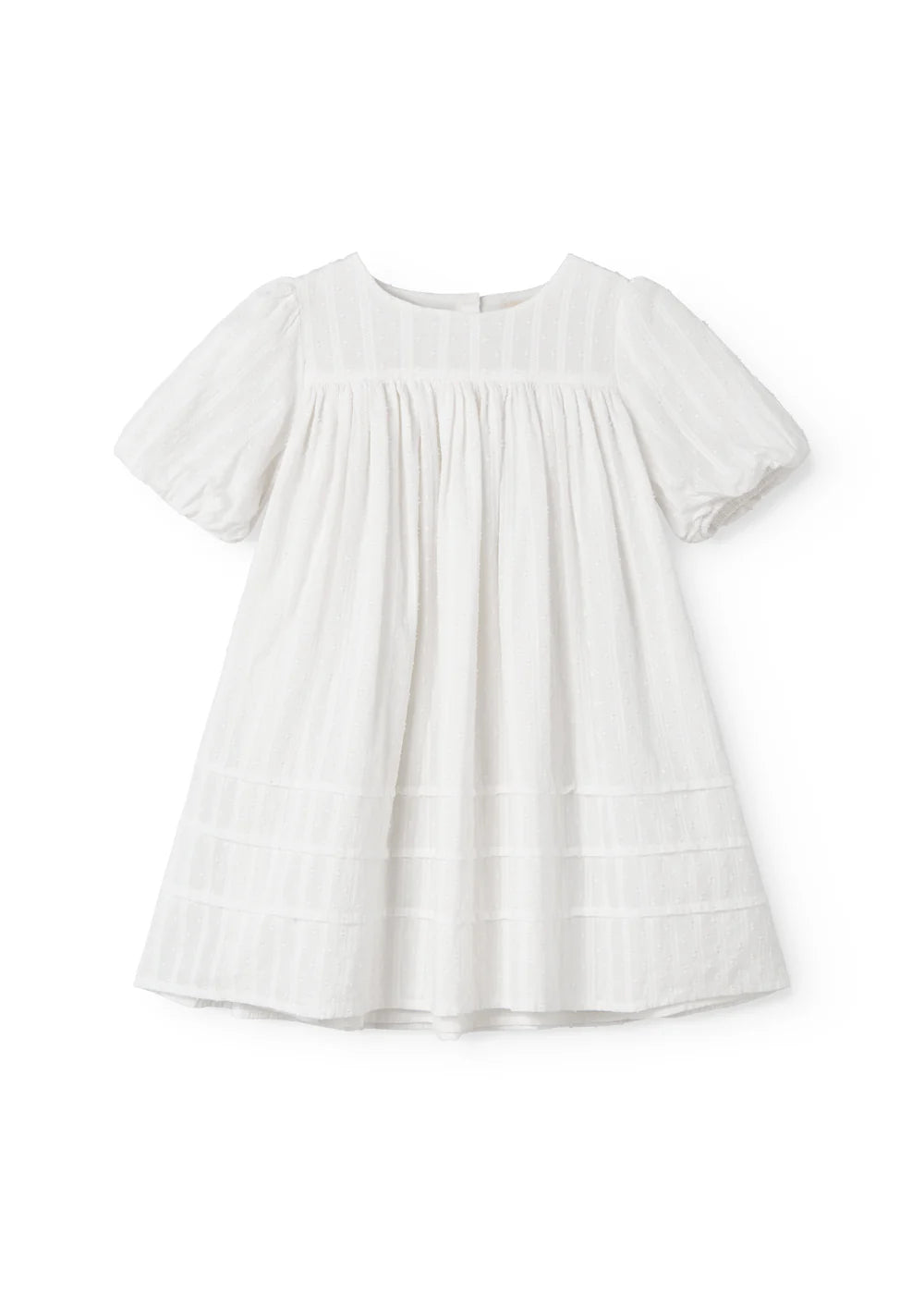 De stof heeft een subtiel textuurpatroon met kleine details, wat de jurk een extra luxe en unieke uitstraling geeft. De knoopsluiting aan de achterkant maakt het aan- en uitkleden eenvoudig en praktisch – een fijne toevoeging voor zowel ouders als kinderen.