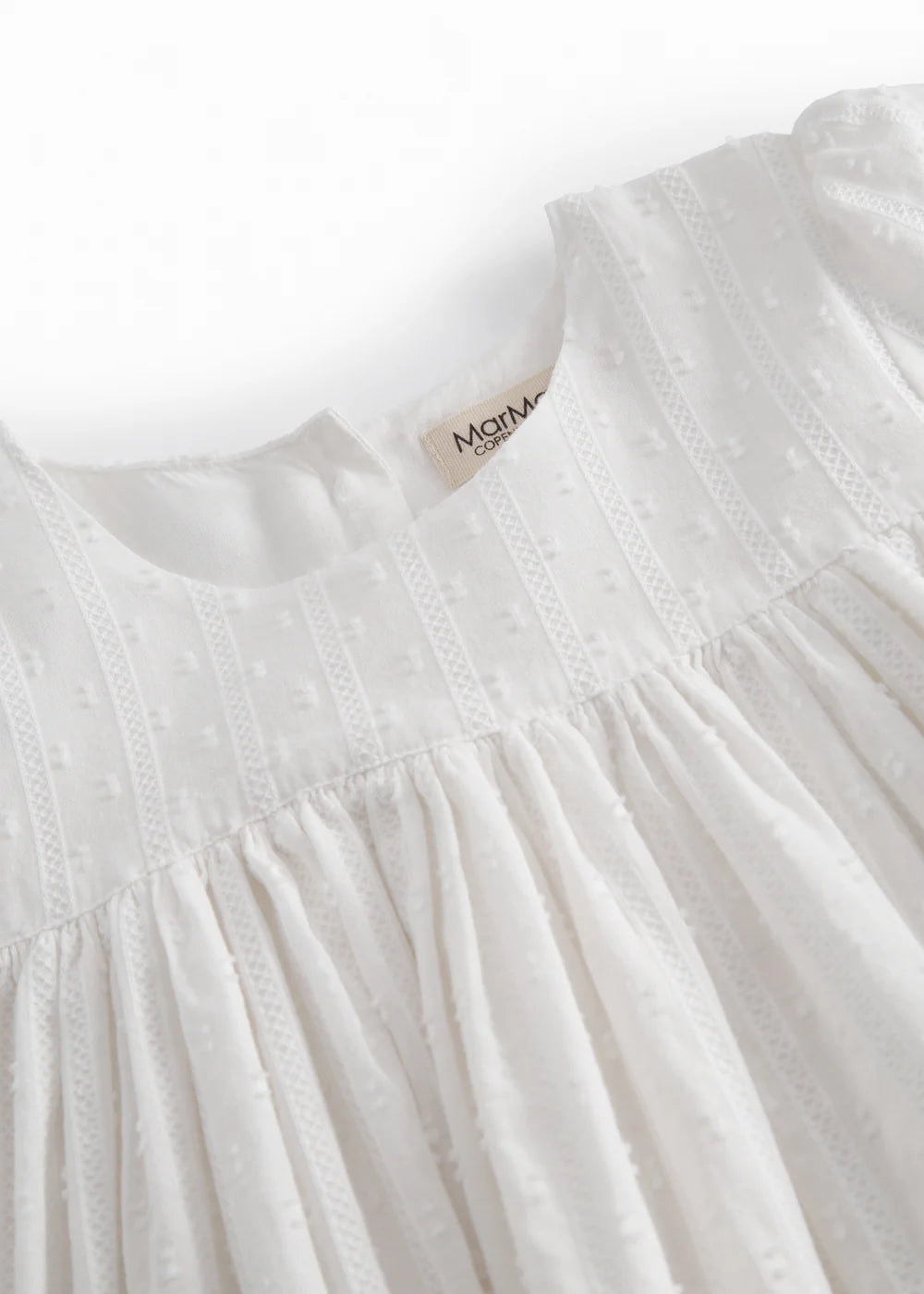 Op zoek naar een tijdloze en elegante zomerjurk voor jouw kindje? De MarMar Copenhagen Duky jurk in wit is een prachtige toevoeging aan iedere kindergarderobe. Deze jurk combineert Scandinavisch design met comfort en kwaliteit, precies waar MarMar Copenhagen om bekend staat.