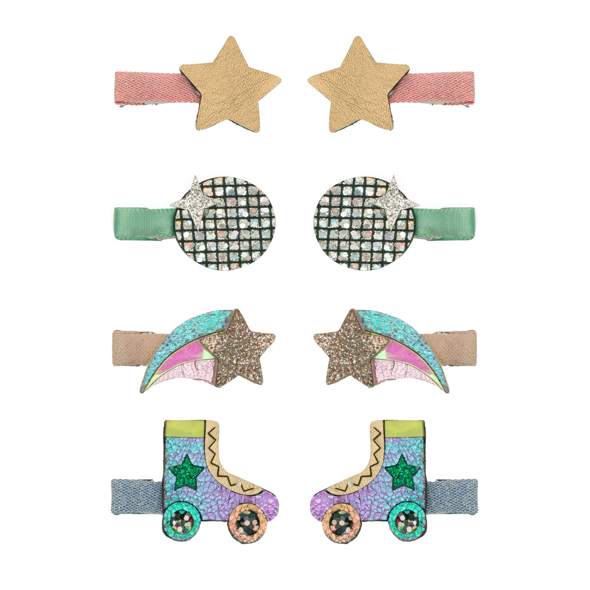 - Uniek Ontwerp: De set bevat acht clips in vier verschillende ontwerpen: een gouden ster op een roze clip, een glinsterende ster op een turquoise clip, een spiegelende discobal op een groene clip en retro rolschaatsen op een beige clip.